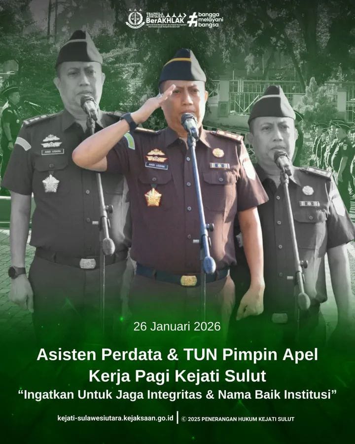 MANADO, Lintaskabarkan.id – Kejaksaan Tinggi Sulawesi Utara (Kejati Sulut) kembali melaksanakan apel kerja pagi pada Senin, 26 Januari 2026. Apel tersebut digelar di halaman Kantor Kejati Sulut dan diikuti oleh seluruh jajaran pegawai.