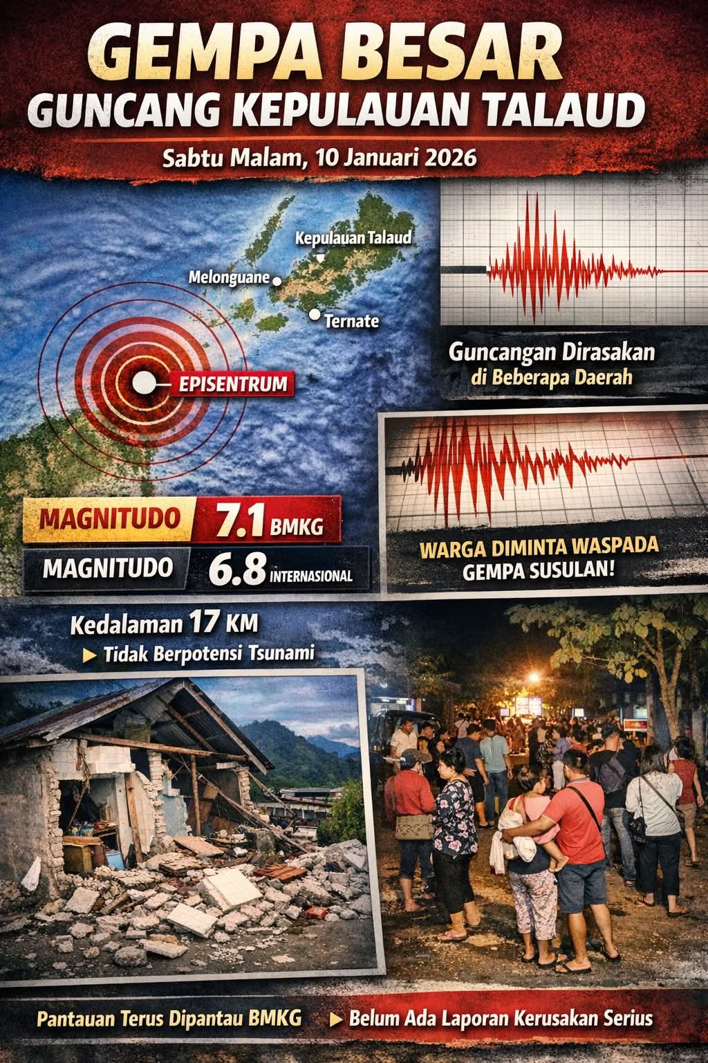 Melonguane, LintasinvestigasiIndonesia.Com — Gempa bumi berkekuatan besar kembali mengguncang wilayah laut di sekitar Kepulauan Talaud, Sulawesi Utara, pada Sabtu malam, 10 Januari 2026. Badan Meteorologi, Klimatologi, dan Geofisika (BMKG) mencatat gempa terjadi pada pukul 22.32 WIB atau sekitar pukul 23.32 WITA.Berdasarkan data awal BMKG, gempa memiliki magnitudo 7,1 dengan pusat gempa berada di laut, dekat Melonguane, Kepulauan Talaud, pada kedalaman sekitar 17 kilometer di bawah permukaan laut. Sementara itu, lembaga pemantau gempa internasional German Research Centre for Geosciences (GFZ) mencatat kekuatan gempa berada pada kisaran magnitudo 6,8.