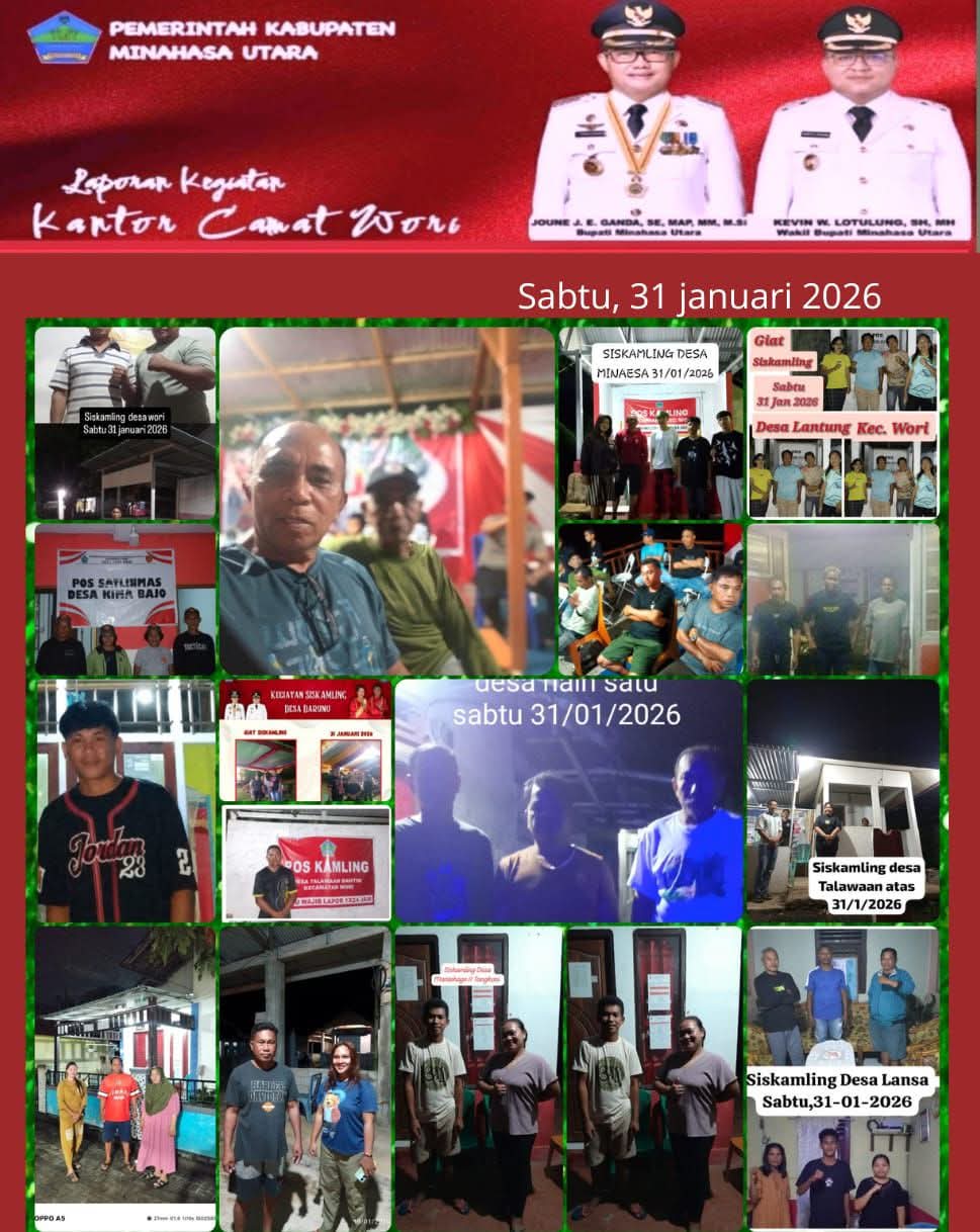 Kecamatan Wori, Lintaskabarkan.id – Giat Siskamling (Sistem Keamanan Lingkungan) yang dilaksanakan pada hari Sabtu, 31 Januari 2026 di Kecamatan Wori telah berjalan dengan lancar, aman, dan kondusif. Kegiatan ini melibatkan berbagai unsur, termasuk Hukum Tua, Babinsa, Babinkamtibmas, Perangkat Desa, Linmas, dan masyarakat setempat. (31/01/2026)