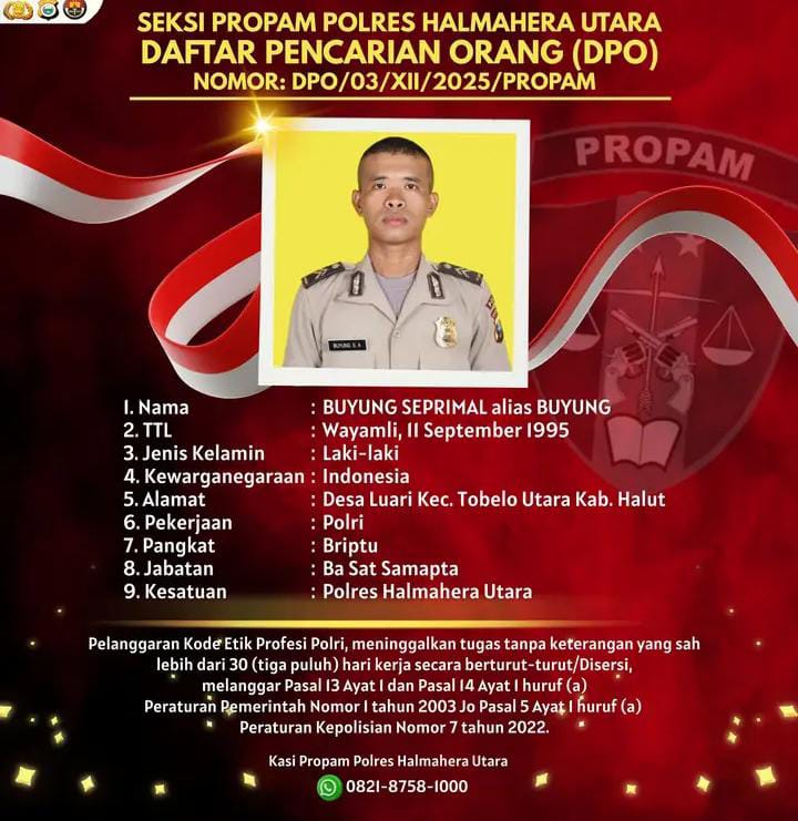 Penetapan DPO tersebut tertuang dalam pengumuman resmi Propam Polres Halmahera Utara dengan Nomor: DPO/03/XII/2025/PROPAM. Anggota yang bersangkutan diketahui bernama Buyung Seprimal alias Buyung, berpangkat Briptu, dengan jabatan Ba Sat Samapta Polres Halmahera Utara.