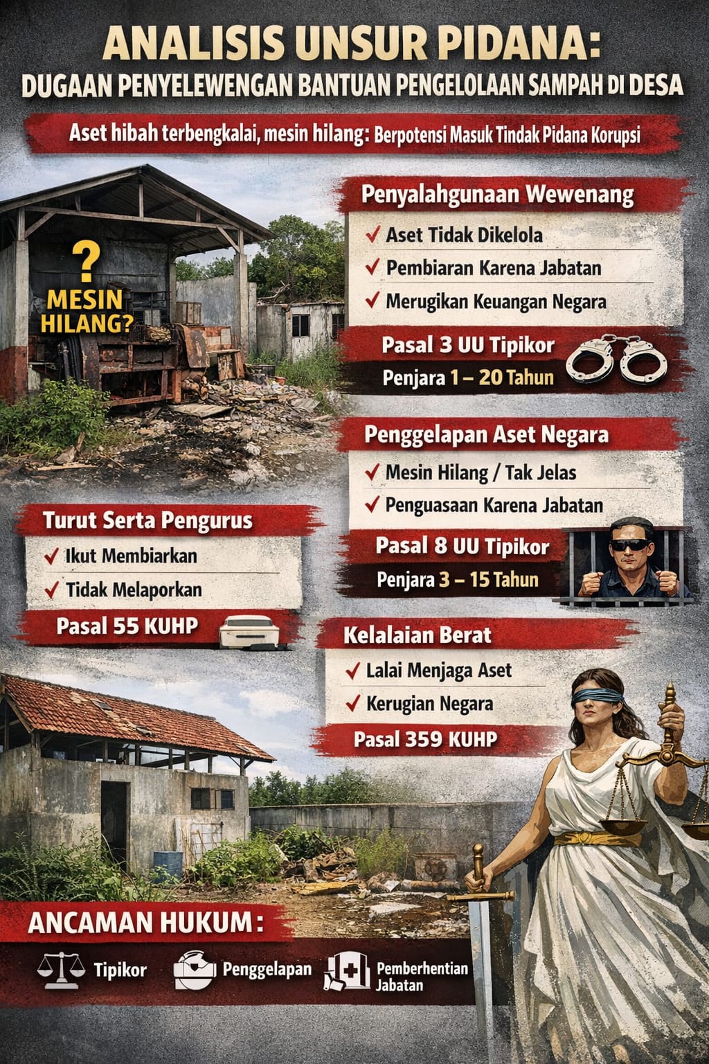 Jangan ada yang bermimpi bisa cuci tangan. Secara hukum, setiap jengkal fasilitas TPA adalah Aset Desa (UU Desa No. 6/2014, Pasal 76). Pembiaran aset hingga hilang atau rusak secara hukum dikategorikan sebagai Kejahatan Jabatan.