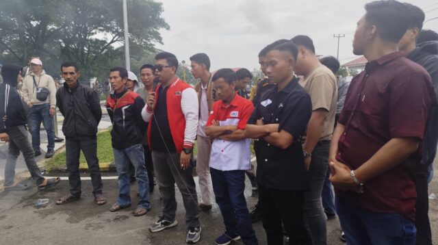 Aksi massa di depan Kantor Bupati Konawe menuntut kejelasan batas wilayah dan validitas sertifikat yang disebut tidak sesuai dengan objek lahan percetakan sawah di Anggaberi.